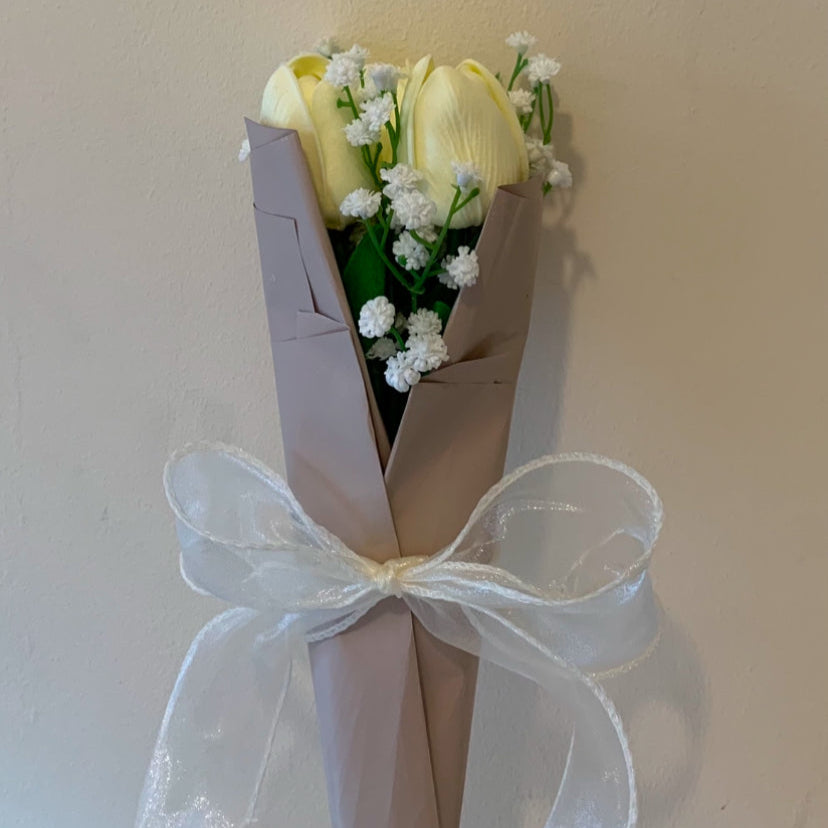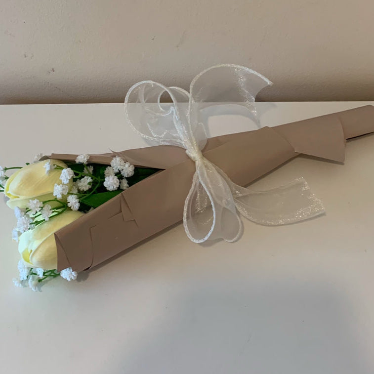 A soft small bundle of buttery yellow tulips and fluffy gypsophila, wrapped in gentle khaki and tied with a pastel silk ribbon— like the first glow of morning in a fairy’s garden.
